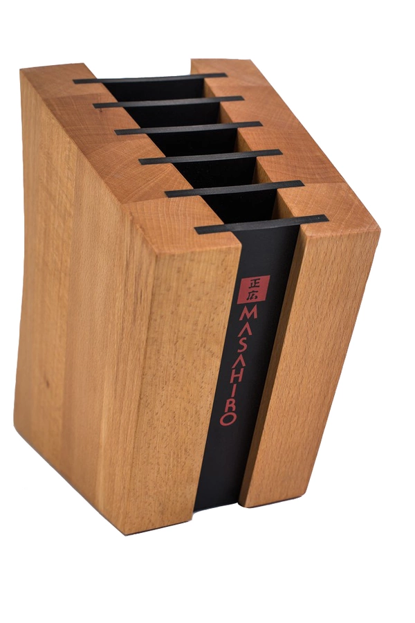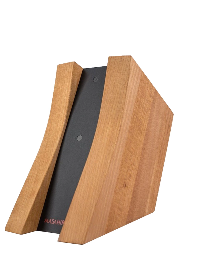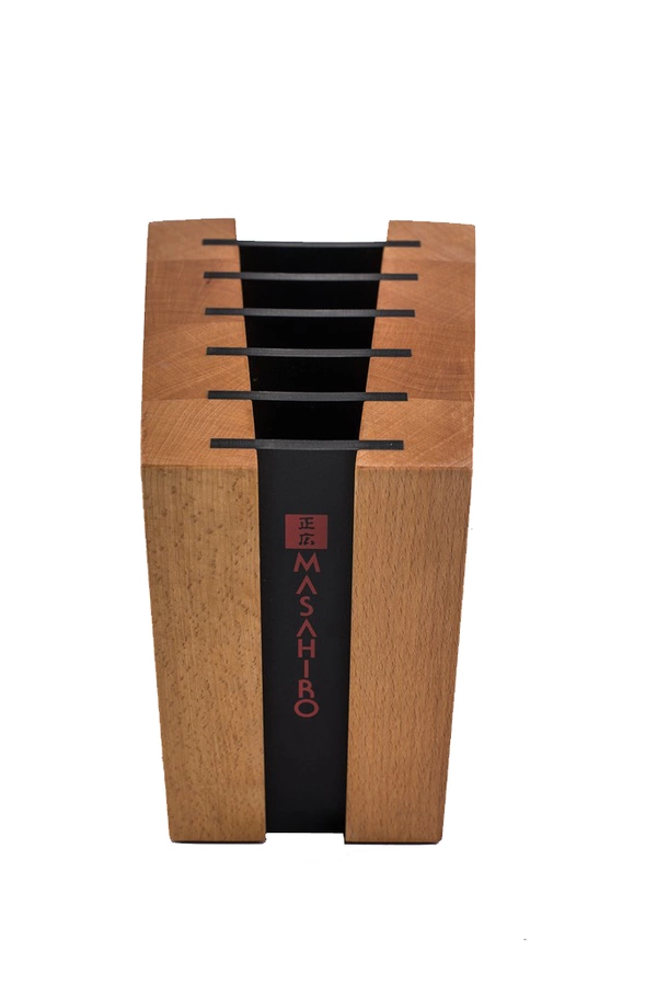 Magnetyczny blok na noże Masahiro wykonany z naturalnego drewna bukowego, przeznaczony do przechowywania maksymalnie sześciu noży. W każdej przegrodzie znajdują się magnesy dzięki czemu wyciąganie i odkładanie noży jest wyjątkowo łatwe. Tego typu rozwiązanie zapewnia również bezpieczne przechowywanie noży bez ryzyka uszkodzenia krawędzi tnącej czy też czubka.
