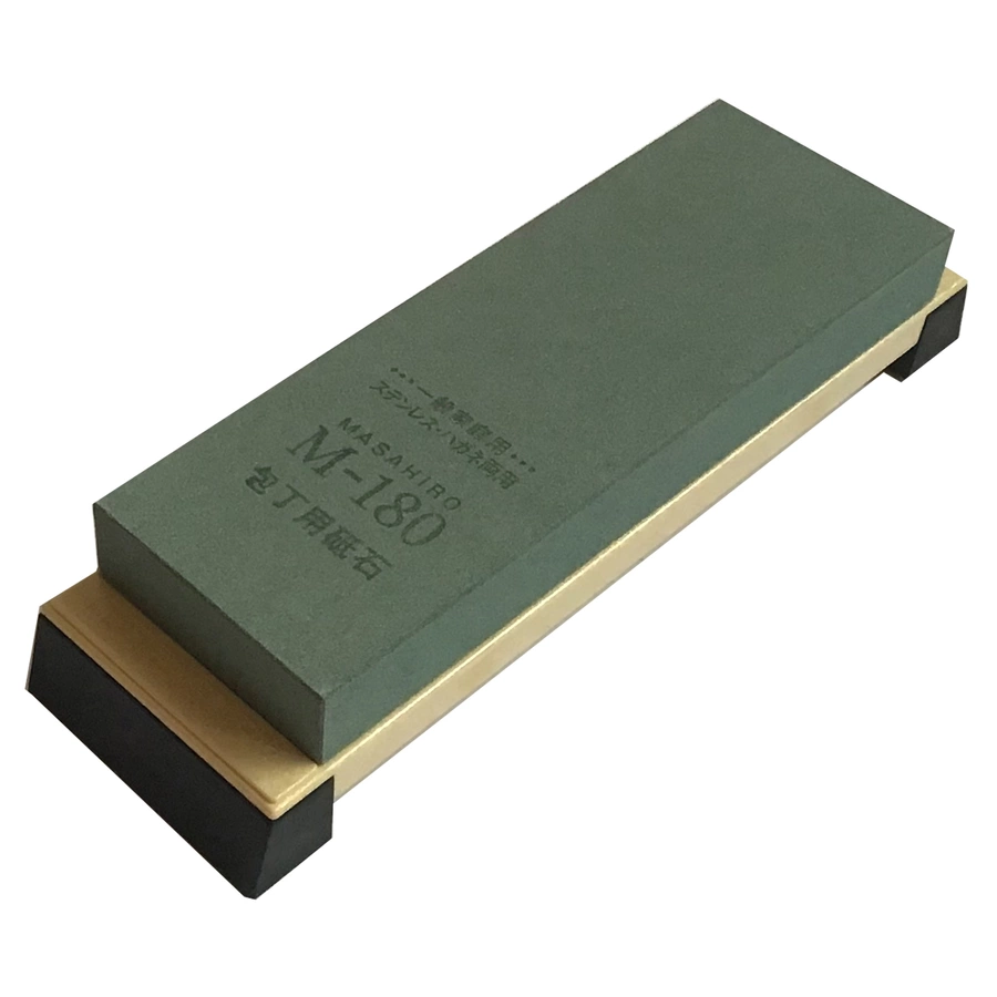 Kamień ostrzący Masahiro M-180 Rough to płaski kamień na planie prostokąta o wymiarach 190x65x17mm i gradacji (ilość ziaren, drobin ściernych na cm2) 180 wykorzystywany ostrzenia do bardzo tępych lub z uszkodzoną krawędzią tnącą noży. Kamień o takiej gradacji jest jednym z najczęściej używanych przyrządów do ostrzenia noży. Kamień został osadzony na podstawie z tworzywa wyposażonej w gumowe, antypoślizgowe stopki. Przed użyciem kamień powinien być umieszczony na kilka minut w wodzie a w trakcie ostrzenia nie powinien pozostawać suchy.