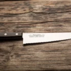 Jedną z najbardziej ekscytujących rzeczy w tym nożu jest ząbkowana krawędź, która w połączeniu z asymetrycznym, dwustronnym ostrzeniem sprawia, że ostrze to pozostaje w gotowości do pracy przez bardzo długi czas. Ząbki na krawędzi wywierają znacznie większy nacisk na krojony produkt, a piłujący ruch pozwala na bezproblemowe cięcie. Tego typu rozwiązanie znajduje szerokie zastosowanie. Szczególnie dobrze sobie radzi z produktami miękkimi w środku i twardymi na zewnątrz jak np. dojrzałe pomidory, cytrusy, pieczywo. Nóż z takim ostrzem przypadnie do gustu tym użytkownikom, którzy poszukują narzędzia nie wymagającego regularnego ostrzenia.